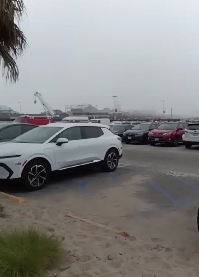 parking lot near a beach on a foggy day. Cars are parked in marked spaces, some partially obscured by a palm tree on the left. In the distance, a pier is visible, though its details are softened by the fog. Beach umbrellas can be seen further out. The parking lot surface is sandy. The camera appears to be moving slightly, possibly from someone walking.