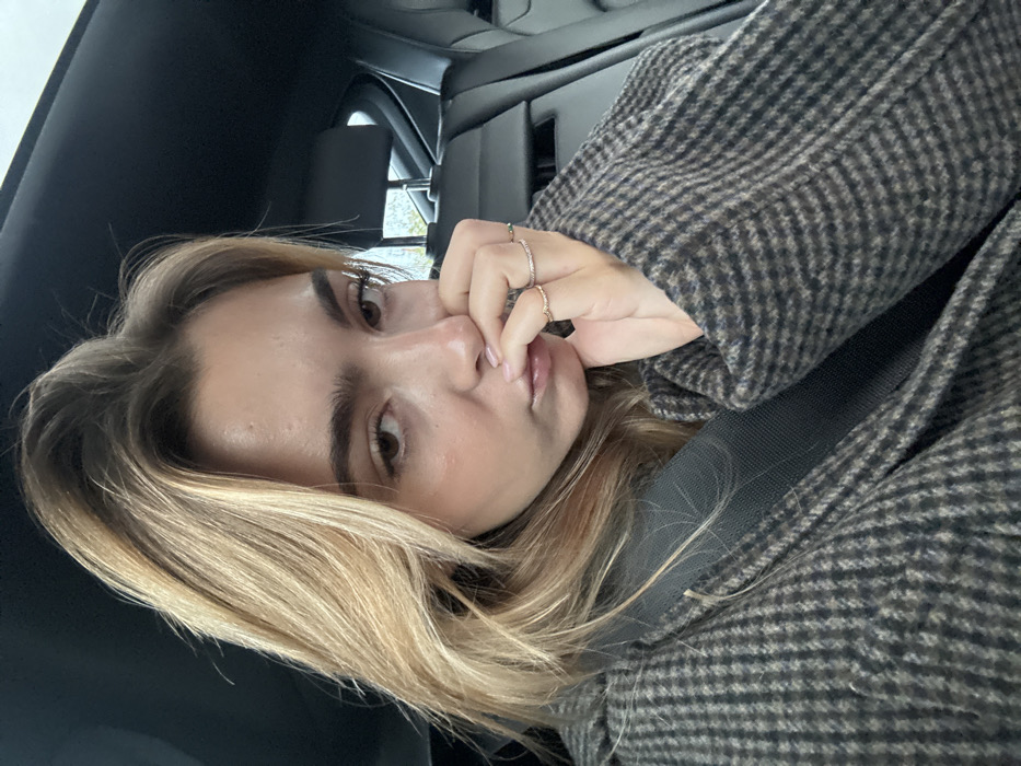 A female individual is seated in the front passenger compartment of a vehicle in the city of Unknown, Unknown. She has light brown and blonde hair, brown eyes, and is looking directly at the camera. She wears a brown and black checkered or houndstooth pattern coat, with a black seatbelt positioned across her left shoulder and chest. Her right hand is raised, with fingers partially covering her mouth and chin. Three rings are visible on her right hand: one thin gold-toned band on the ring finger, and two thin silver-toned bands on the middle finger, one possibly adorned with small stones. The vehicle's interior features dark upholstery and headliner. Through the rear window, blurred green foliage and a grey sky are visible, suggesting an outdoor environment.