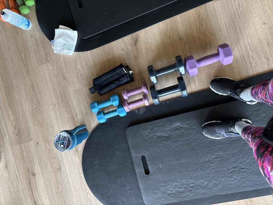 An overhead shot shows a workout space with a light wood floor. Exercise equipment includes two black mats, a pair of ankle weights, and three pairs of dumbbells in varying colors: blue, purple, and gray. A white towel, a water bottle, and a blue tumbler are also present. A person wearing black sneakers and patterned leggings stands on one of the black mats.