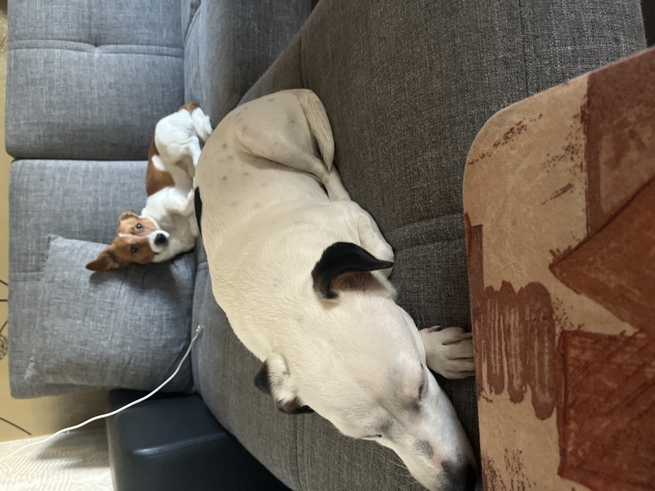 This image, situated in Lom, Bulgaria, depicts two canines resting on a grey fabric sectional sofa in an indoor environment. In the immediate foreground, a white dog with black-patched ears is observed lying on its side, head resting on its front paws, with its eyes closed, indicative of sleep or deep rest. Faint dark speckles are visible on its white fur. Further back on the sofa, a smaller brown and white dog is positioned higher on the backrest. This canine's head is turned towards the viewer, its eyes open and ears alert (one erect), suggesting active observation of its surroundings. A thin white cable is draped over the left side of the sofa, extending downwards from above the left armrest. A partial view of a brown and tan patterned surface, consistent with a tabletop, is visible in the bottom right corner of the frame. The scene is illuminated by ambient light.
