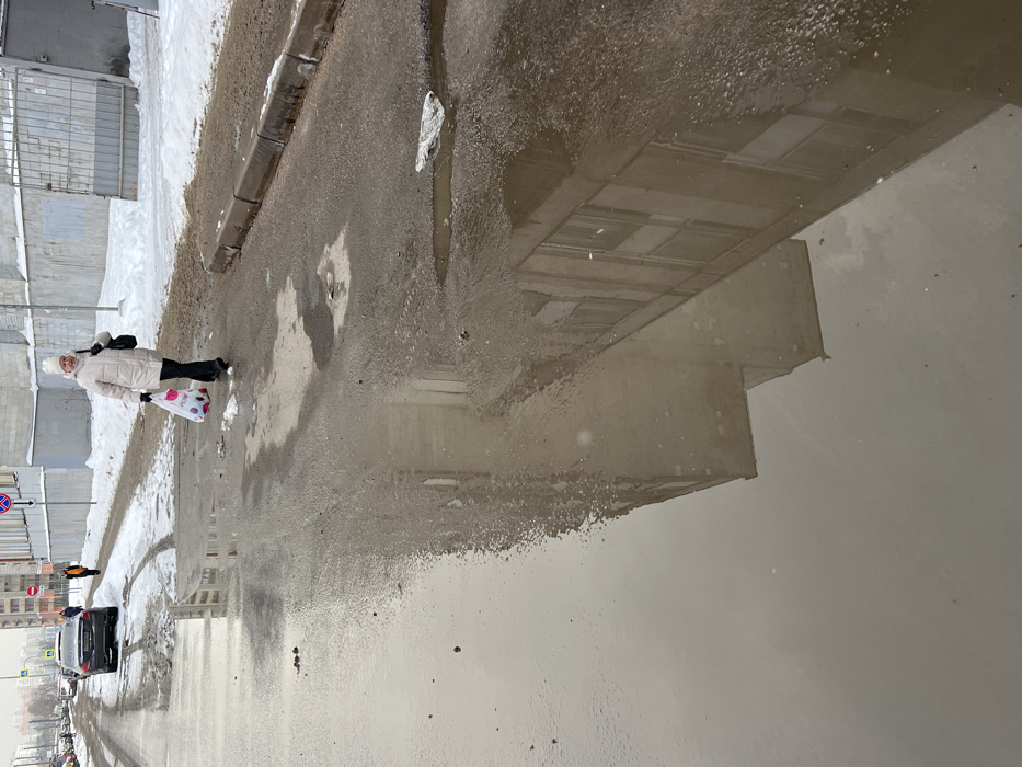 The image depicts a winter-to-spring transition street scene in Murino, Russia, under an overcast sky