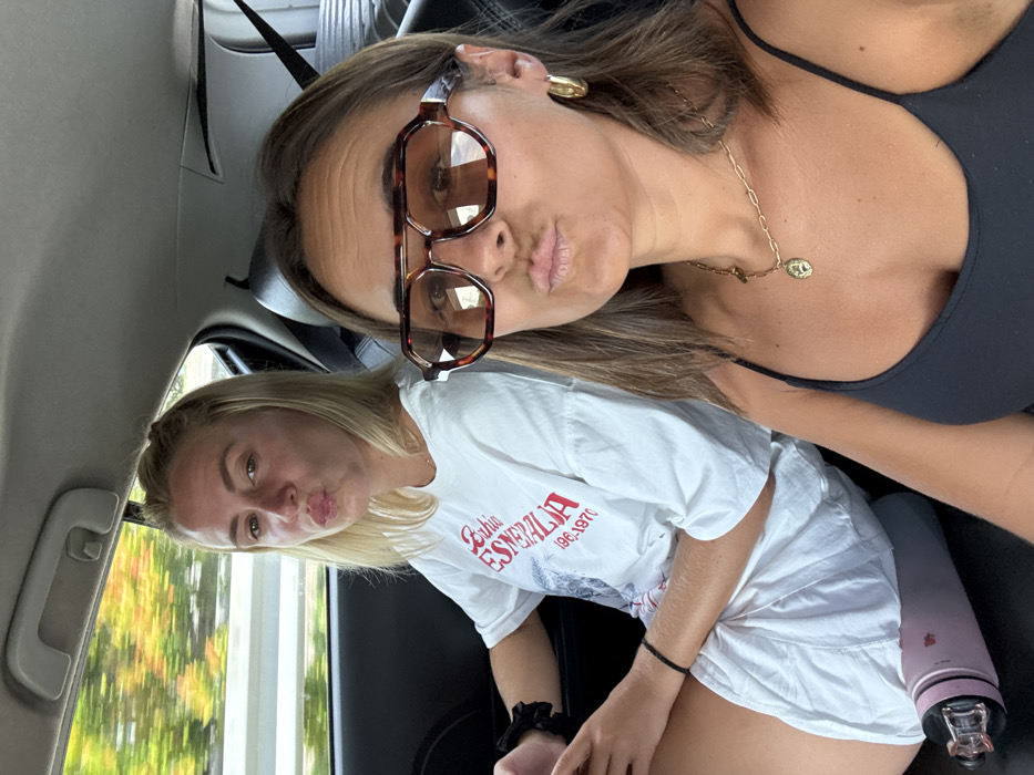Two young women are posing for a selfie inside a vehicle. The woman in the foreground wears large, tortoise-shell sunglasses and a black tank top, making a kissing face. The second woman has blonde hair and wears a white graphic tee. Both are positioned in the back seat. A pink water bottle sits next to the blonde woman. A glimpse of the outside scenery is visible through the car window. The interior of the car is primarily gray and black.