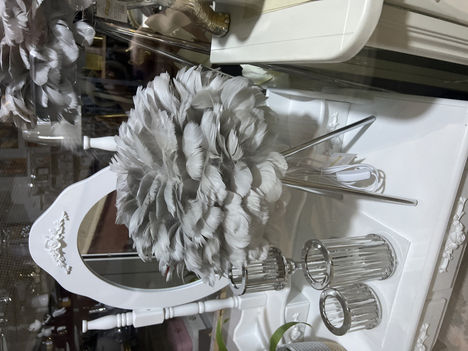 The scene depicts an illuminated retail display within a commercial establishment in the Smederevska Palanka Municipality, Serbia. A white, ornately carved dressing table or console serves as the primary surface for the merchandise. Centrally positioned on this table is a spherical table lamp featuring a lampshade composed entirely of numerous light gray feathers, supported by three slender, chrome-finished legs. A white power cord with an inline switch is visible extending from the lamp's base. To the left of the feather lamp, a freestanding oval mirror with a white, carved frame adorned with rose motifs at the top reflects a blurred interior environment. Further to the left, three silver-toned, cylindrical decorative holders, designed with vertical clear elements, are arranged on the table; one is taller and pedestal-mounted, while two are shorter. A small segment of a potted plant housed in a two-tone woven container is visible in the lower-left corner. The reflections on an apparent glass storefront or display case reveal indistinct elements of an exterior environment and additional interior merchandise. No individuals are present in the image.
