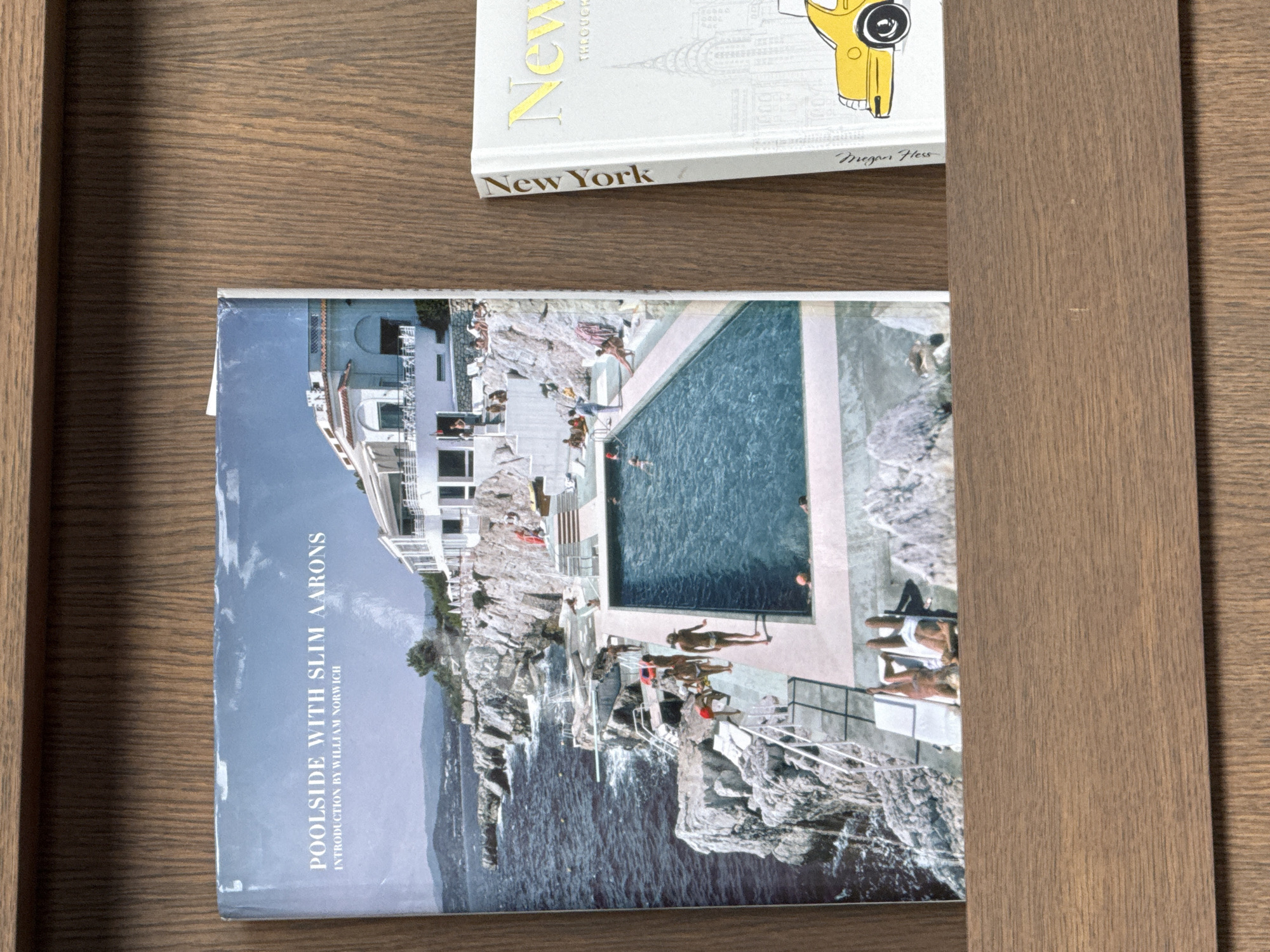 two books on a wooden surface. One book is titled "Poolside with Slim Aarons, Introduction by William Norwich." The book cover depicts a poolside scene with a swimming pool, people sunbathing and swimming, a building, rocks, and the ocean. The second book is titled "New York, Megan Hess," and has a white cover with a yellow illustration. The scene suggests an indoor setting with a wooden surface.