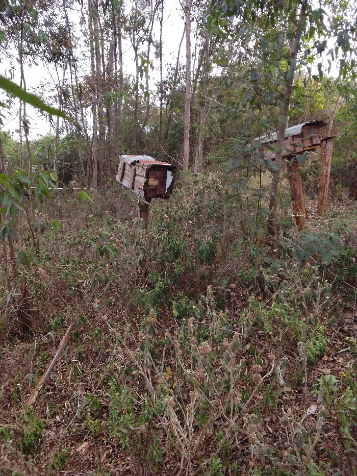 Two rustic wooden beehives are elevated on posts amidst a dense, overgrown landscape. Tall, slender trees form a background, their leaves sparse against a pale sky. The undergrowth is thick with a mix of dry, brown vegetation and patches of green foliage, obscuring the ground. The beehives are constructed from rough-hewn planks, with metal sheets providing makeshift roofs. The setting evokes a rural or semi-wild environment where beekeeping is practiced.