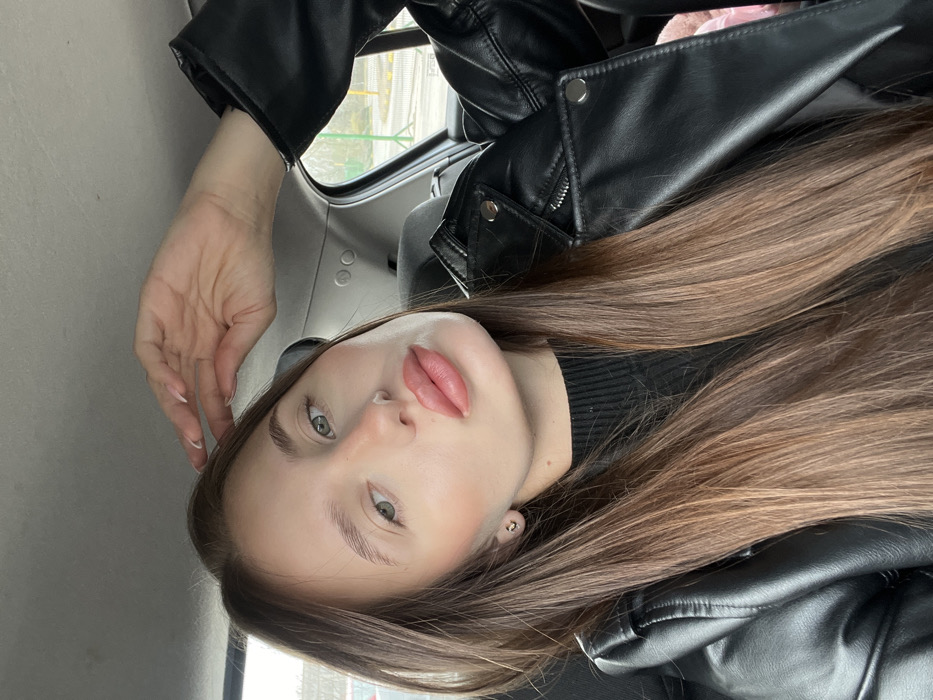 A female individual is depicted in a close-up, chest-up shot from within a vehicle's passenger compartment. She has long, straight, medium-brown hair, green eyes, and full, light pink lips, gazing directly towards the camera. She is wearing a black ribbed top beneath a black faux leather moto-style jacket featuring silver-colored snaps and zippers. Her right hand, exhibiting manicured light-colored nails, is raised with fingers splayed, positioned near the top of her head. The vehicle's interior headliner is light gray, and rear passenger window trim is visible. Through the partial view of the rear passenger window, an outdoor environment is seen, characterized by green foliage, a light-colored building or wall, and a green pole, under what appears to be an overcast sky. A pink plush object is partially visible behind the subject's right shoulder. The specific location within Ruse, Bulgaria, cannot be determined from the visible background elements.