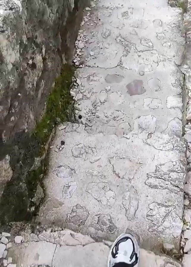 person descending a stone staircase. The steps are cracked and surrounded by loose rocks. The camera is positioned above the person, looking down at their feet as they walk. They are wearing black pants and white sneakers with black stripes. As they move down the stairs, the video pans to reveal a stone wall to the side of the staircase, and eventually a wide view of a coastal town and harbor with mountains in the distance. Several people are walking along the path near the wall. The sky is partially cloudy.