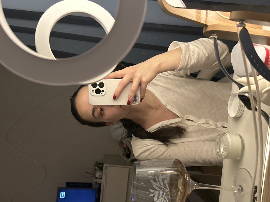 In a room located in Nekrasovskiy, Russia, a female individual is captured in a mirror selfie. The individual, wearing a white, long-sleeved button-up top and a delicate necklace, has dark hair styled in a braid over her left shoulder. Her right eye is visible, while her left hand, displaying red nail polish, holds a white smartphone that covers the left side of her face. The phone's multi-lens camera array is visible on its back. A white ring light is partially reflected on the right side of the mirror. On a white surface in front of the individual, a stemmed wine glass with an etched leaf design contains a light amber liquid. Adjacent to the glass is a small, clear glass jar filled with a white substance, positioned near an open silver lid. Other objects on the surface include a dark watch strap and a white brush-like item. The background, visible in the mirror's reflection, includes a television displaying a blue screen atop a white dresser or cabinet, a light-colored wall featuring a wavy relief or cable, and vertical dark stripes suggesting window coverings.