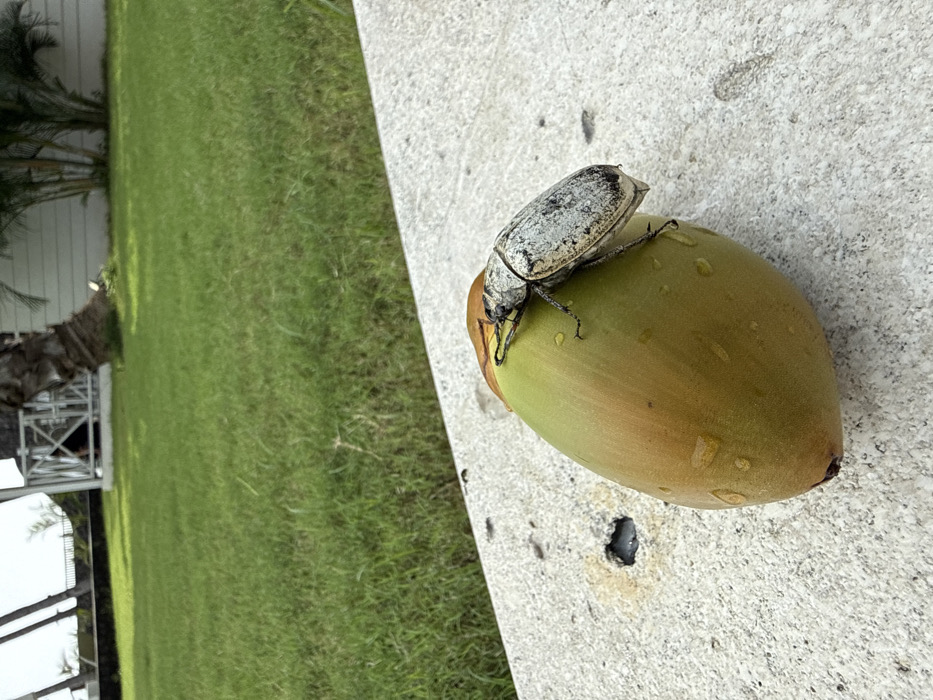- "A beetle with a speckled gray and white carapace rests atop a young, unripe coconut" by FM-paSbB2, licensed under CC BY 4.0