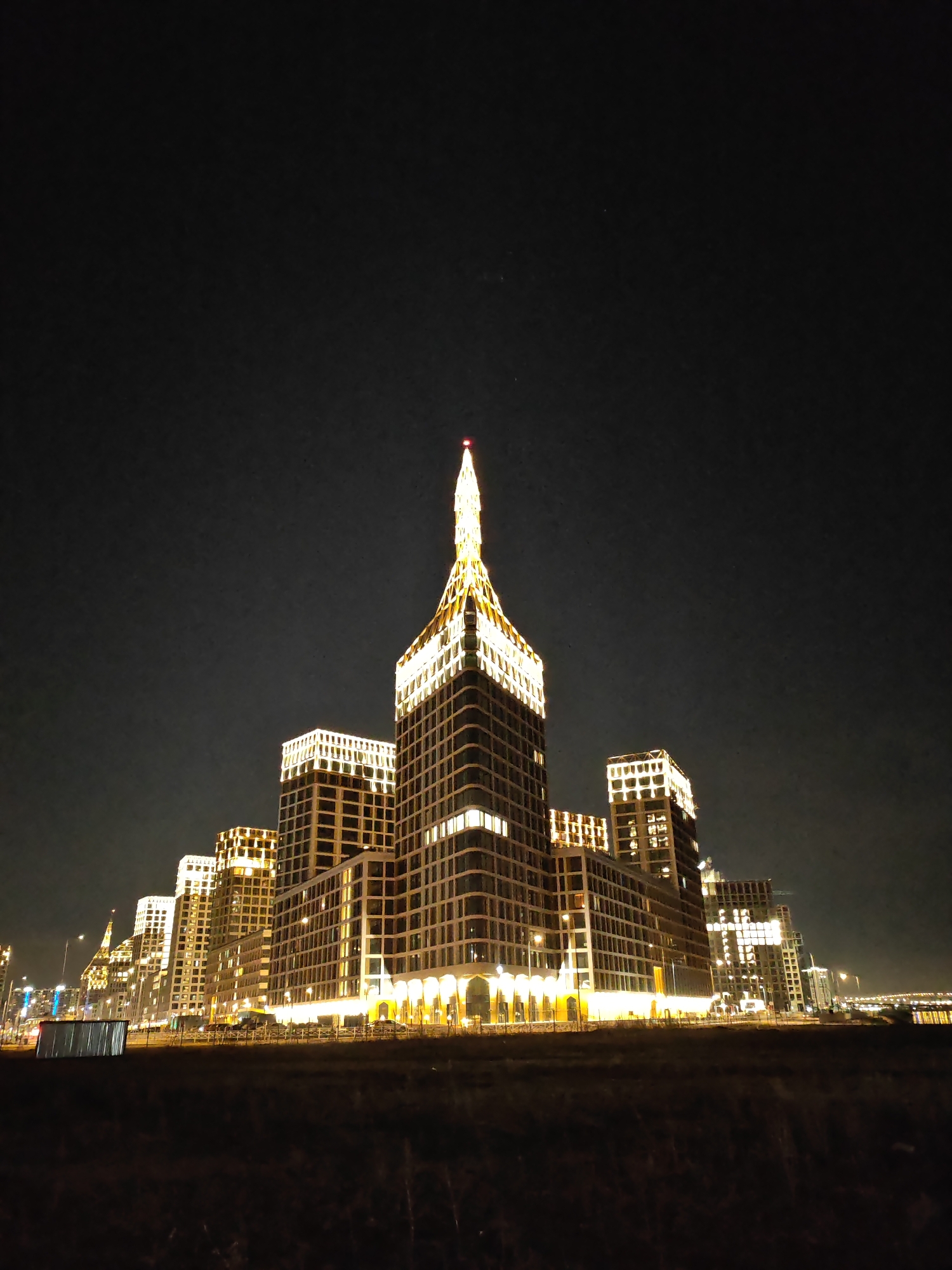 series of illuminated buildings at night, likely located in Saint Petersburg, Russia. The buildings have a modern architectural style and are arranged in a line, decreasing in height from the center towards the edges. The tallest building features a prominent spire topped with a red light. The buildings are lit with warm, white light that highlights their facades and windows. The foreground consists of a dark, grassy area, suggesting an open space or field. In the distance, streetlights and other buildings can be seen, indicating an urban environment. The sky is dark.