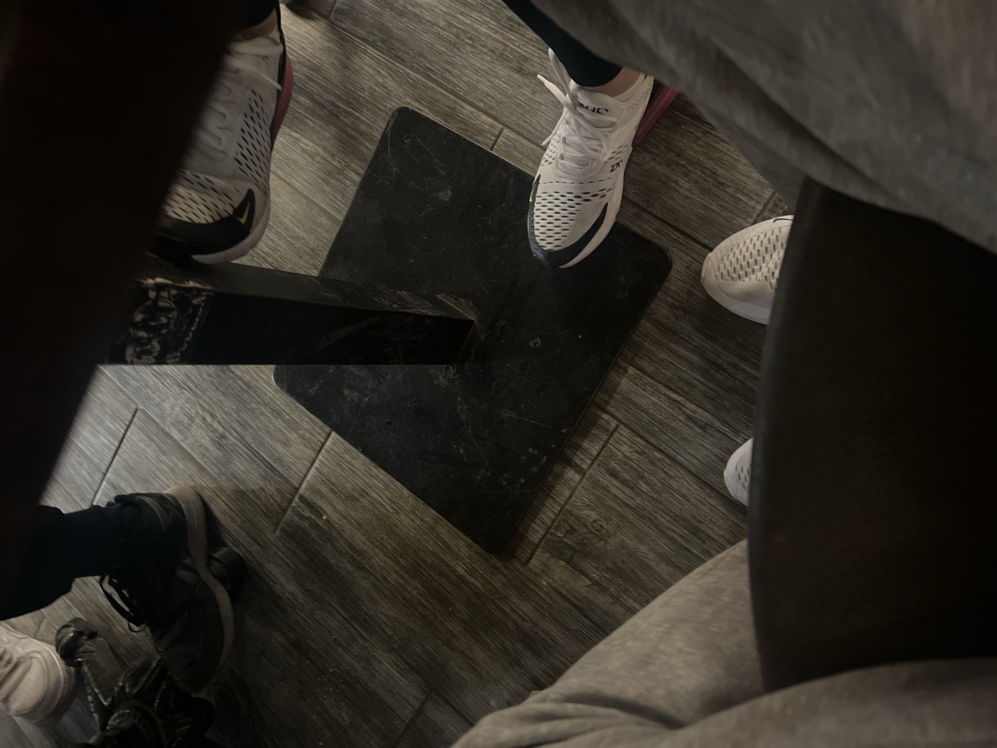 gathering of at least four people indoors, as indicated by the presence of multiple pairs of feet and legs surrounding a dark, square table base