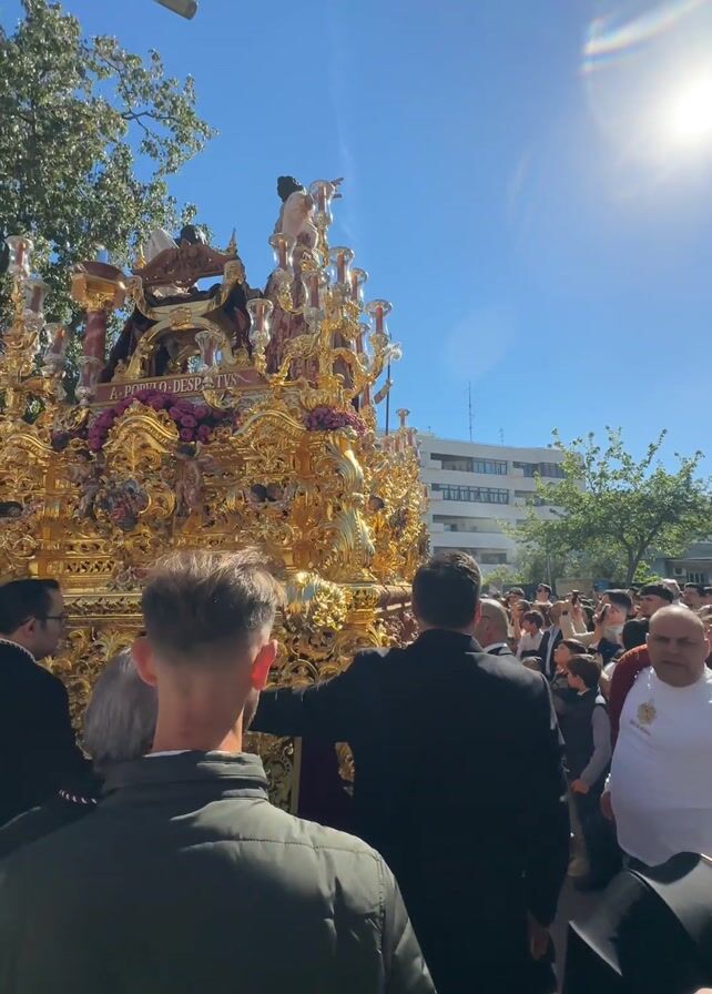 The video captures a religious procession under a bright blue sky with a blinding sun. A large, ornate, golden platform is carried through a crowd of people. The platform's details are obscured by the sun's glare, but it appears to hold figures on top. Most of the crowd is seen from the back, dressed in dark jackets and white shirts. A building is visible in the background, adding to the urban setting of the procession. The scene is filled with movement and the sounds of a band playing.