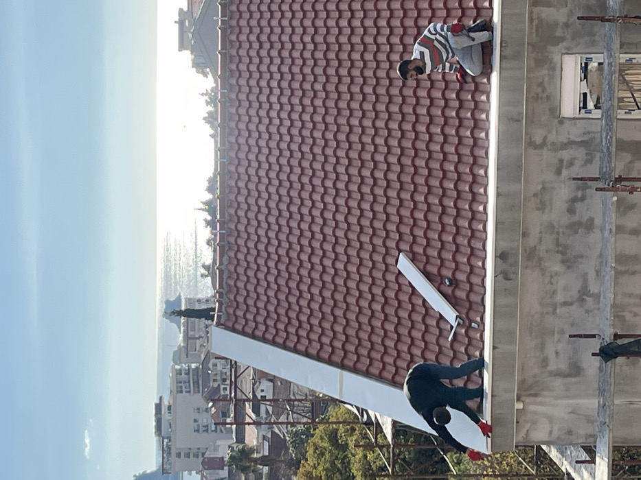 This image depicts two male construction workers engaged in roofing activities on a building in Budva, Montenegro, under a clear, bright blue sky with direct sunlight