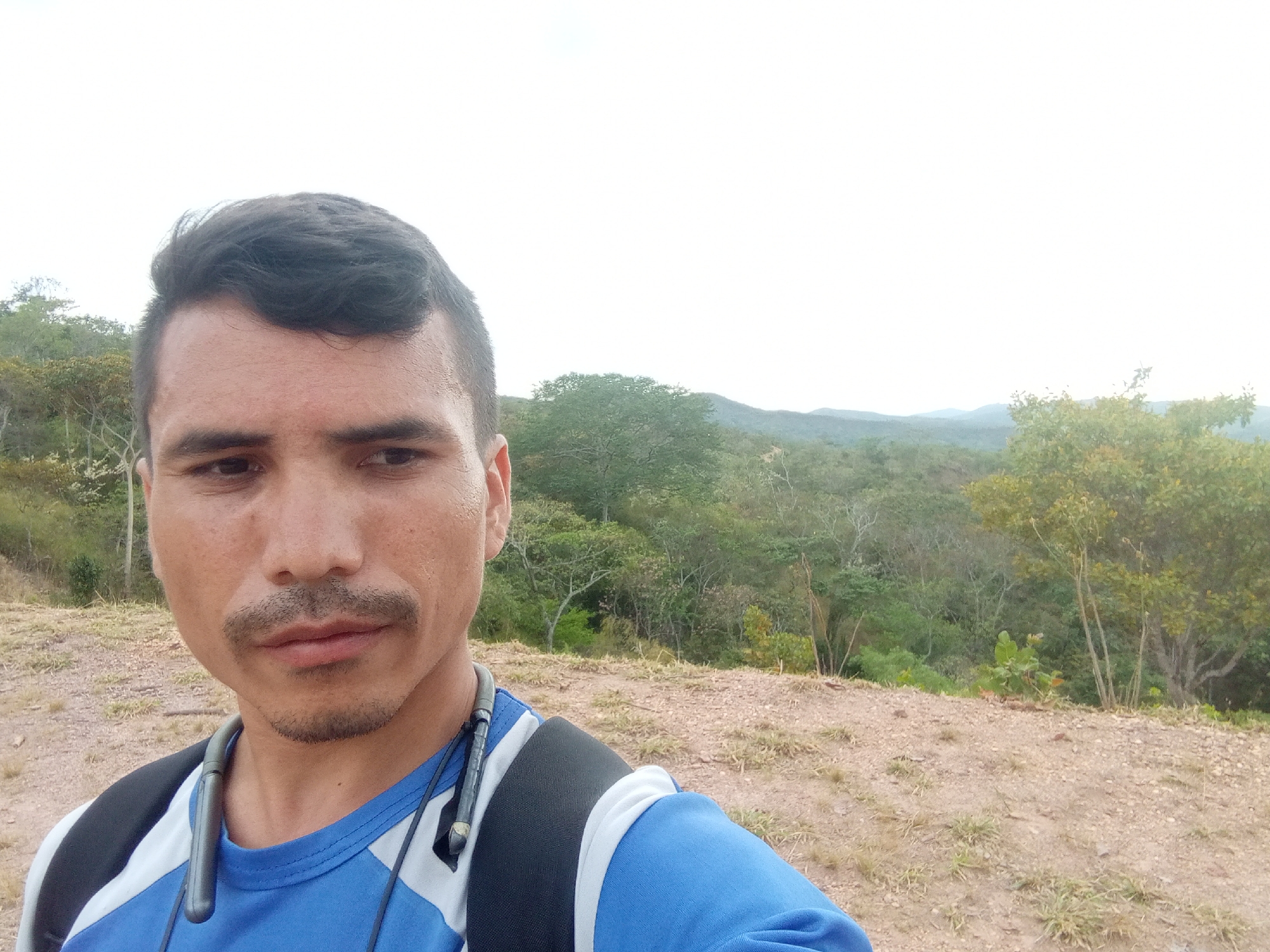 A medium shot depicts a man with dark hair and brown eyes, wearing a blue and white shirt and a black backpack. He also has what appears to be bluetooth headphones around his neck. He has a dark mustache and tan skin. The background reveals a natural landscape with rolling hills covered in trees. The sky is overcast and white. The ground appears to be dry and rocky. The man's facial expression is neutral, and he is looking slightly to the left of the camera. There is no evidence to suggest the location is in Las Piñas, Venezuela, or to confirm that it is a city.