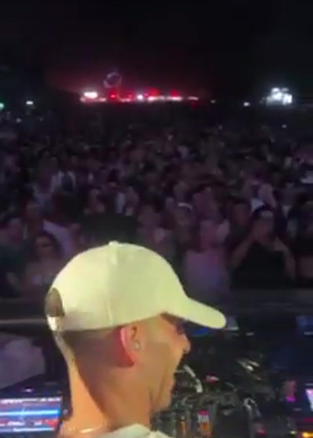 DJ in a white shirt and cap, standing behind a DJ mixer at an outdoor music festival at night. The DJ turns to look at the crowd while laughing. The crowd is dense and illuminated by stage lights in the distance. The camera angle is from behind the DJ, capturing the energy of the event and the enthusiasm of the crowd.