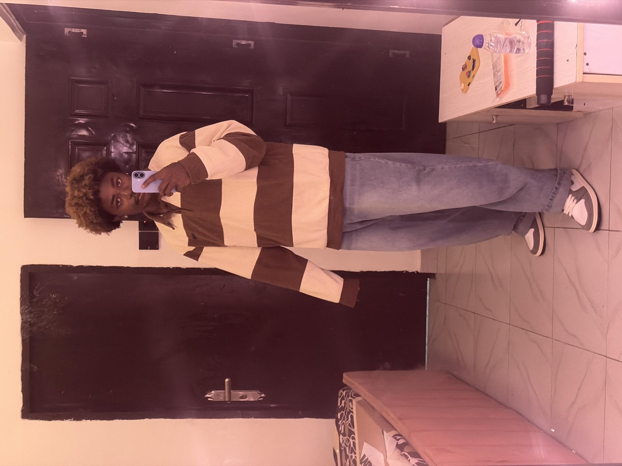 A male individual with dark skin, prominent curly brown hair, a thin mustache, and a left earlobe earring is depicted taking a mirror selfie indoors in Igboefon, Nigeria. He is wearing a long-sleeved, collared shirt with horizontal brown and off-white stripes, light blue baggy jeans, and white and grey sneakers. He holds a light purple smartphone with dual cameras in his right hand, partially obscuring the lower half of his face as he photographs his reflection. The environment features light-colored walls and a tiled floor. Two dark brown paneled wooden doors are visible behind him; the left door includes a silver-colored handle. To the left of the subject, a section of a pinkish-brown upholstered bed frame with patterned bedding is present. To the right, a light-colored wooden table or cabinet displays a yellow smartphone case, an orange object, and a clear plastic water bottle with a purple cap. A black and red striped object is visible beneath the table. The image exhibits a pervasive pinkish tint.