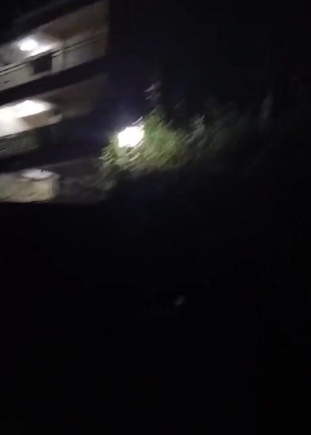 The video begins focusing on a three-story building at night. Lights are on in the units. The camera then pans to the right, away from the building, and the scene becomes very dark with only a single white streak of light visible.