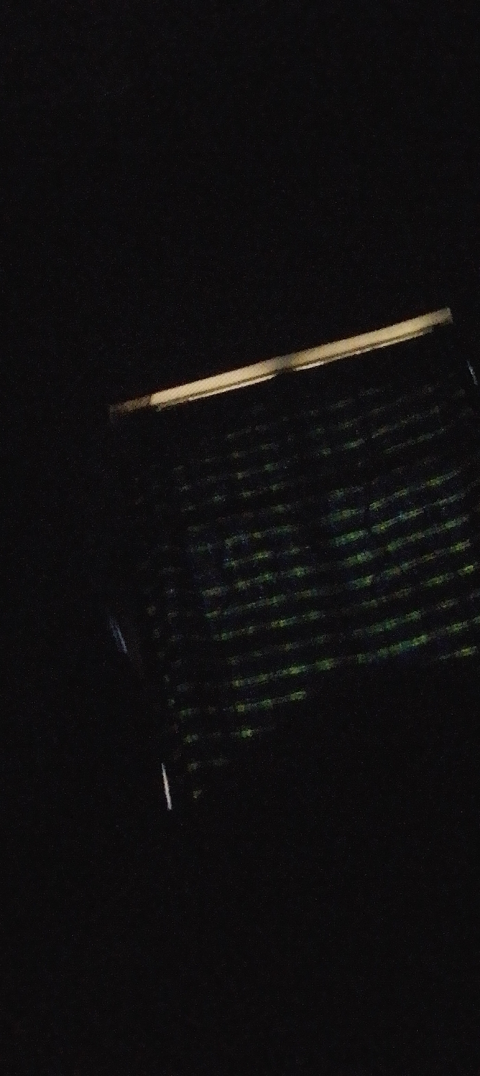 In a dimly lit or nighttime scene, a rectangular object with horizontal lines is visible