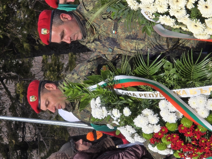 This outdoor scene in Shipka, Bulgaria, features two uniformed male individuals standing in a solemn posture