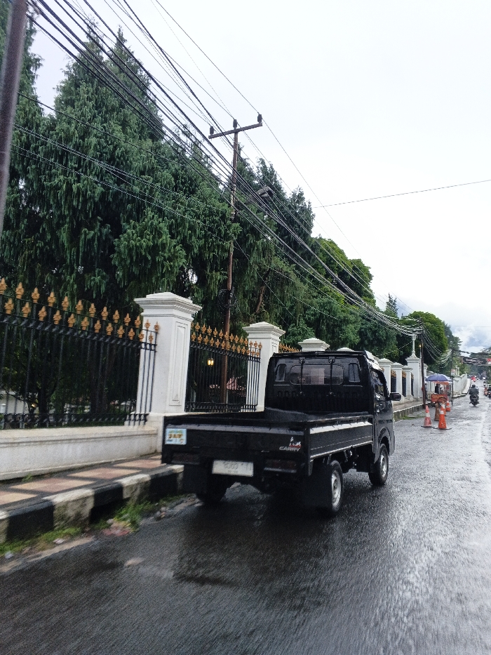 The image depicts a street scene in Sindangjaya, Indonesia, on what appears to be an overcast day with wet road conditions, indicative of recent rain. A black Suzuki Carry pick-up truck, observed from its rear-right quarter, occupies the left side of the wet asphalt road. Its rear license plate, partially obscured, reads "B 8003." To the left of the truck, a sidewalk with a black and white striped curb borders an ornate black metal fence featuring numerous gold spear-top finials, supported by white decorative pillars. Behind this fence, a dense line of tall, dark green evergreen trees rises prominently. Multiple utility cables are strung across the upper portion of the frame, attached to a wooden utility pole. On the right side of the road, several orange traffic cones are spaced out. Further down the street, a vendor's cart with a purple umbrella is visible, attended by a person beneath it, and a motorcycle is also present in the distance. The background shows more foliage and indistinct elevated terrain under a cloudy sky.