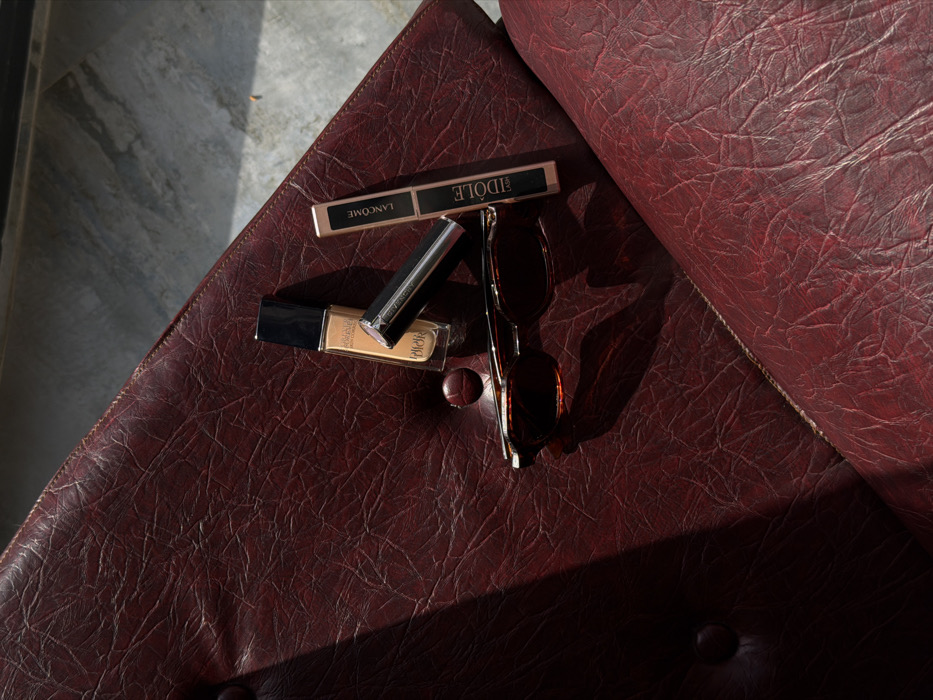 An overhead perspective captures a still life arrangement of cosmetics and sunglasses on a deep red, tufted, textured upholstered surface, likely an armchair or sofa, within an interior space in Yerevan, Armenia