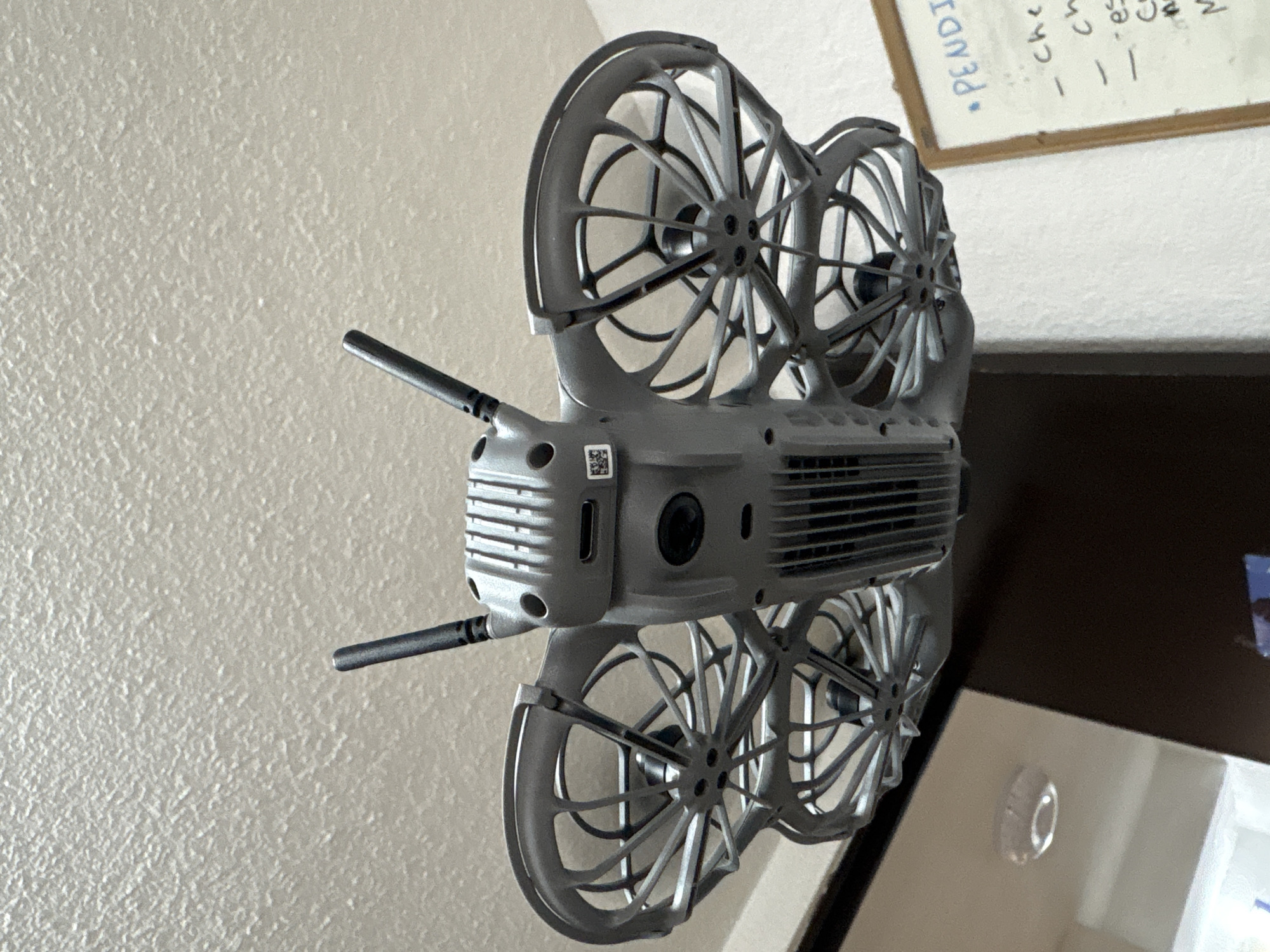 A grey quadcopter drone, consistent with an FPV cinewhoop model, is depicted hanging upside down. Its four propellers are encased within integrated grey protective guards. Two black whip antennas extend upwards from the drone's rear section. The underside of the drone is visible, displaying a central camera lens, a series of cooling vents, and a white label with a QR code or serial number on its right side. The drone is positioned against a textured, off-white ceiling that occupies the upper half of the image. In the lower-left quadrant, a dark brown vertical panel, possibly a door or cabinet, is partially visible. To the lower right, a white dry-erase board with handwritten text in blue and black marker is present. Legible text includes a heading starting with "PENDI" and bullet points such as "che", "ch", "es", and "M". A round, clear ceiling fixture is faintly discernible in the far lower-left background. The scene is located indoors in Cuernavaca, Mexico.