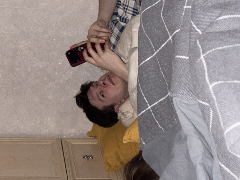 The scene depicts an indoor environment, likely a bedroom. The specific location within Moscow, Russia, is not discernible from the image details. A young adult male with dark hair is lying on his left side, propped up by a cream-colored pillow, looking directly towards the viewer. He is wearing a light-colored plaid shirt with blue and white squares. His hands hold a mobile phone encased in a red protective cover, which displays a dual camera lens setup on its rear. Partially visible in the lower-left foreground is the crown of another person's head with dark hair, situated adjacent to two yellow pillows. The bedding consists of a grey blanket with a white grid pattern, partially covering a plain blue-grey sheet. To the left of the male subject, a light-colored wooden cabinet with two drawers and brass-colored pull handles is visible. The background wall behind the bed has a light tone with a textured, possibly reflective or glittered finish. Illumination is dim, suggesting ambient or low light conditions.