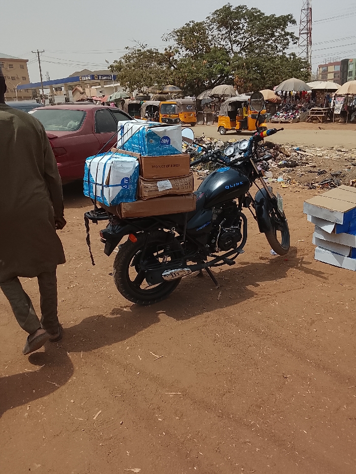 The image depicts an active outdoor scene in Karum, Nigeria, under bright daylight. The foreground consists of reddish-brown dirt ground. On the left, the lower torso and legs of an individual, dressed in a light-colored, long tunic-like garment and dark footwear, are visible as they walk away from the camera to the left. Central to the frame, a black Qlink brand motorcycle is parked on its kickstand, facing slightly right. The motorcycle's rear rack is heavily loaded with cargo, secured with straps. This cargo includes multiple packages: at least two prominent white and blue striped boxes labeled "SMT" and "PRODUCT OF KOREA," along with several smaller brown cardboard boxes positioned underneath. To the immediate right of the motorcycle, a stack of white and blue boxes, similar to those on the motorcycle, rests directly on the ground. In the midground, a dark red sedan is parked on the left, partially obscured by the walking individual. Beyond the sedan, a blue sign for "Ramsoil" petrol station is visible. The central and right midground features an open-air market area, characterized by numerous parked yellow three-wheeled auto-rickshaws (Keke Napep). Multiple market stalls, each topped with a large, light-colored umbrella providing shade, display various goods on tables. The ground in the market area shows signs of litter and debris. The background includes several large green trees, distant buildings, and a tall, reddish-brown metal communication tower positioned on the far right horizon.