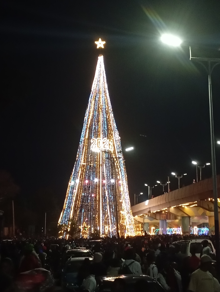 - "A towering Christmas tree, adorned with shimmering lights and a star on top, stands amid a large crowd at night" by FM-IJinB2, licensed under CC BY 4.0