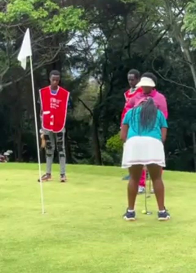 woman putting on a golf green. She is wearing a white visor, pink shirt, turquoise shirt, and white skirt. Two other people stand to her right and a man stands to the left of the hole holding the flag. He wears a red vest with "1" on it. The green is surrounded by trees.