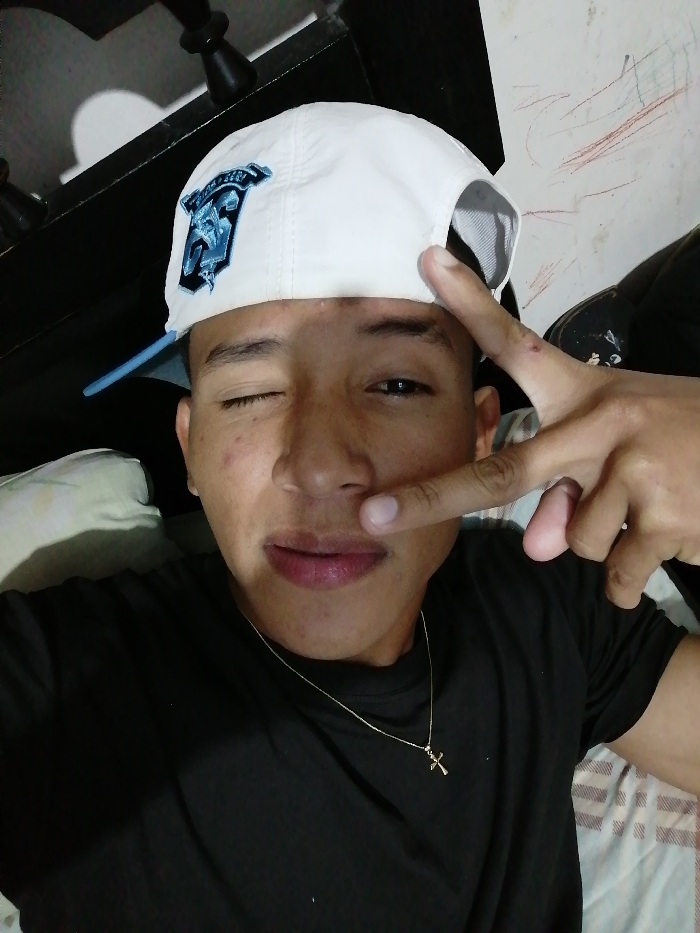 A young man winks and points to his lip. He wears a white baseball cap with a blue logo, a black t-shirt, and a gold cross necklace. He rests against a pillow on a bed with a patterned sheet. The background includes part of a headboard and a wall with faint scribbles. The lighting is somewhat dim.