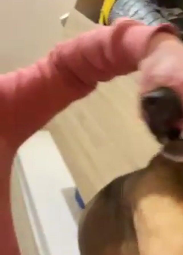 - "A person in a pink long-sleeve shirt is shown brushing the teeth of a brown and black dog" by FM-1D9yJ3, licensed under CC BY 4.0