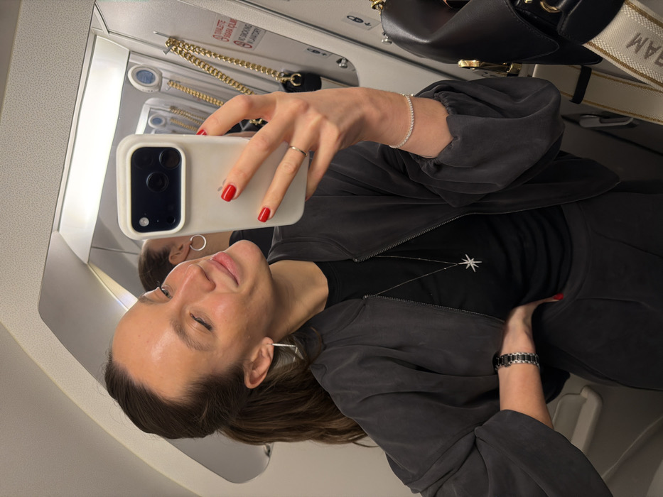 A woman in an airplane lavatory takes a selfie. She holds a white smartphone with red manicured nails. She wears a black t-shirt with a star design, a dark jacket, and jewelry, including a silver bracelet, a ring, and earrings. A black handbag with a white strap hangs above her. The background includes lavatory fixtures, like a mirror with a sign, and the plane's interior.