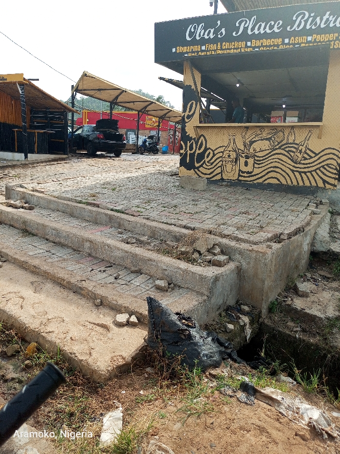 set of concrete stairs leading down to a drainage ditch in Ado Ekiti, Nigeria, located at coordinates 7.649 latitude and 5.226 longitude. The stairs are partially broken and overgrown with weeds. A black plastic bag sits at the base of the steps near the ditch. The steps are made of concrete blocks laid in a pattern. The steps are surrounded by a dirt area with some green grass growing. In the background, a restaurant with a sign that reads "Oha's Place Bistro" is visible. The restaurant is located on a paved area. A person is visible inside the restaurant. The image appears to be taken at a low angle, looking up at the steps. The sky is overcast and gray. The image appears to be taken in the late afternoon or early evening. There is a small amount of litter in the image.