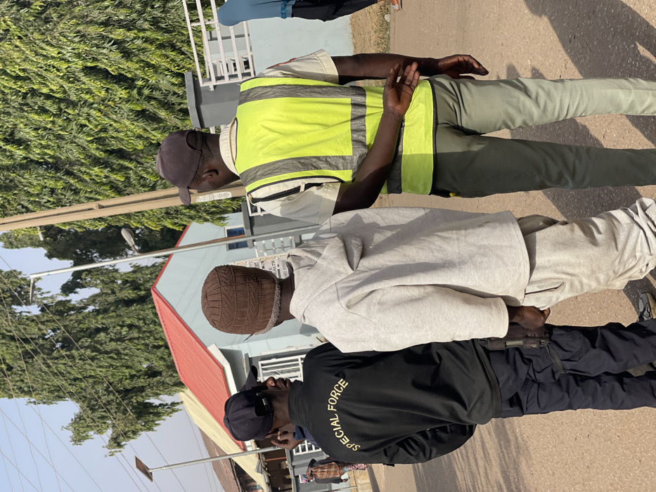 The image captures an outdoor scene in Chikaji, Nigeria, under bright daylight. Three men are positioned on a dirt or unpaved surface, engaged in an interaction. On the left, a man wears a black baseball cap, a black long-sleeve shirt with "SPECIAL FORCE" in yellow lettering across the back, and dark cargo pants. A dark object, consistent with a pistol in a holster, is visible on his right hip. He faces partially right, seemingly addressing the central figure. In the center, a man is seen from the back, wearing a brown knitted beanie, a light grey hooded sweatshirt, and light grey sweatpants. On the right, a third man stands mostly with his back to the viewer, wearing a dark baseball cap, a light-colored collared shirt under a bright yellow high-visibility vest with grey reflective stripes, and olive green trousers. His right arm is bent behind his back. In the background, a light blue building with a prominent red corrugated metal roof is visible. A white sign on this building displays partially visible text including "HEALTH" and "DRUGS." Tall green trees, a solar-powered street light pole, and a utility pole are also present. Other blurred figures are discernible in the distant background.