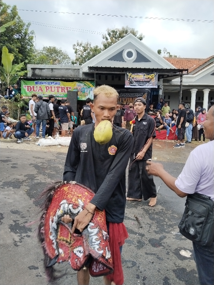An outdoor scene in Sumberejo, Indonesia, depicts a public gathering. In the foreground, a male with bleached blonde hair, wearing a black long-sleeved shirt with a gold emblem and white text, and a red lower garment, holds a red, white, and black decorated Kuda Lumping horse-head mask in his left arm. A green young coconut is visibly pierced through his cheeks. A dark beaded bracelet is on his left wrist. To his right, a second male, barefoot, wears a black cap, a black collared shirt with a white logo, and black wide-legged pants, holding a thin dark stick. A yellow and red garland is around his neck. A third, partially visible male on the far right, wearing a light shirt and a black fanny pack, extends his right arm towards the central figure. The ground is a dark paved surface with scattered light-colored material. In the midground, a crowd of diverse individuals observes from behind the foreground figures. A green and yellow banner advertising "WARUNG SEMBAKO DUA PUTRI" and a black banner with yellow text are displayed. Audio speakers are visible on the left. The background features a white building with a grey triangular roof and a circular decorative element, adjacent to a grey flat-roofed building and residential structures with tiled roofs. Green foliage, including banana trees, is present under an overcast sky.