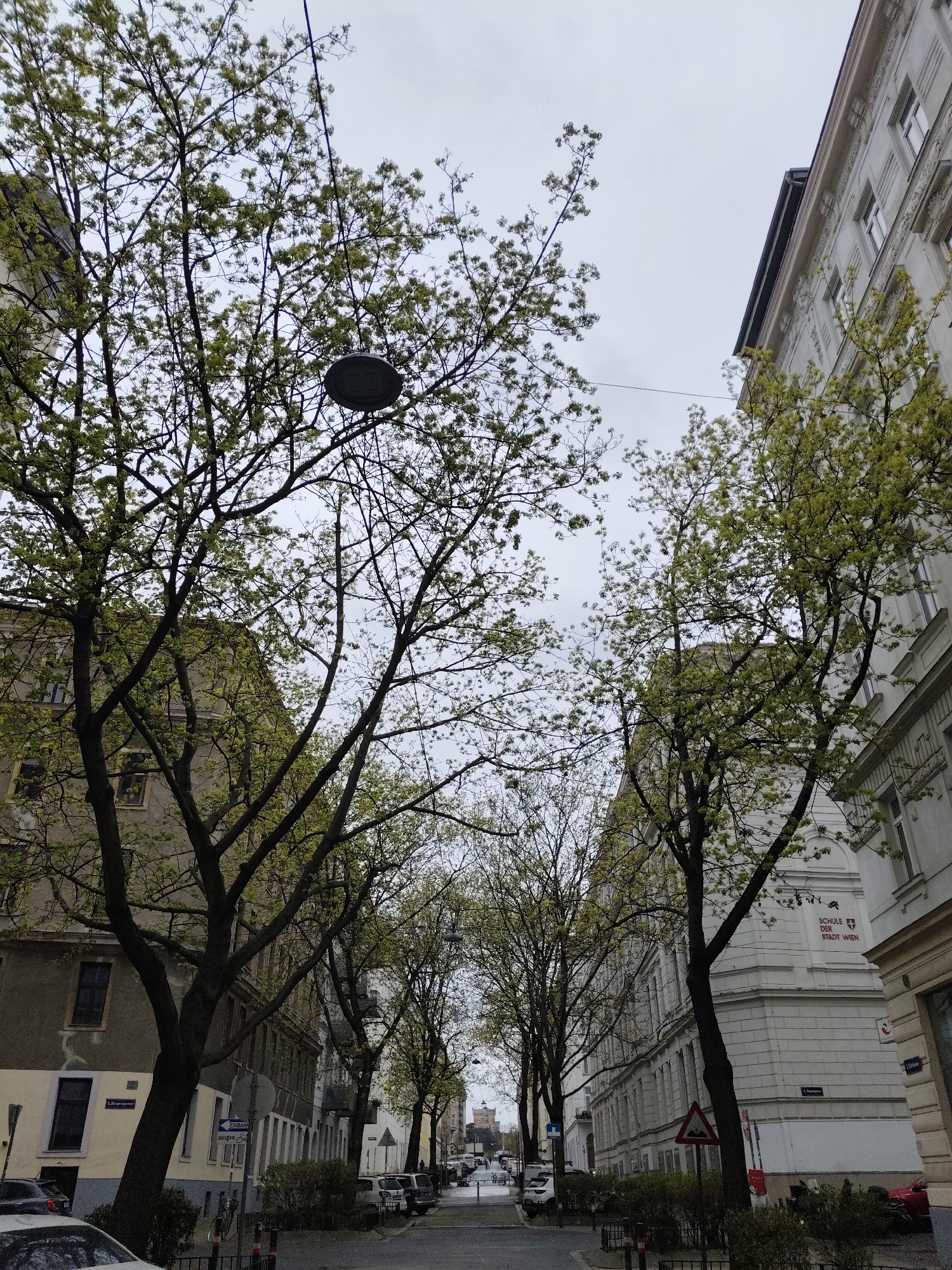 The image depicts a street in Vienna, Austria, lined with buildings on either side. Bare trees with sprouting leaves are planted along the sidewalks, partially obscuring the buildings. A street lamp is visible in the center of the frame. Cars are parked along the street and more cars and people are visible in the distance. The sky is overcast. On the right side of the street, a building labeled "SCHULE DER STADT WIEN" (School of the City of Vienna) is visible. Street signs are present on both sides of the street.