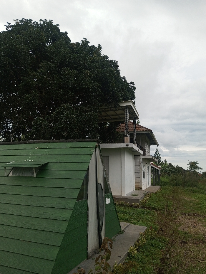 A scene, identified as being in Abbireddygudem, India, is presented under an overcast sky. In the foreground, a green, A-frame structure with horizontal siding is visible on the left, featuring a small, open window vent on its upper left side and a vertical, light-colored fabric entrance on its right side, resting on a concrete base. Behind and to the right of this structure, a series of white-walled buildings extends. The nearest white building has a flat roof with an elevated, open-air balcony structure above it, supported by two white pillars. This upper structure has a metal or corrugated roof and dark checkered fabric draped from its railing. Further right, additional white buildings with brown-tiled roofs are visible. A large, dense green tree occupies the upper left and central portions of the frame, partially obscuring the upper sections of the buildings. The ground in front of and to the right of the structures consists of green grass and low-lying vegetation, extending into a more sparsely vegetated area on the far right. No individuals or specific actions are depicted within the frame.