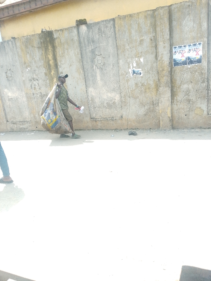 The scene is set outdoors in the city of Agani, Nigeria, under bright daylight conditions. An adult male is observed walking from left to right along a light-colored, possibly unpaved, ground surface. He wears a dark baseball cap, a patterned short-sleeved shirt, dark shorts, and olive green athletic shoes. Over his right shoulder, he carries a large, off-white, soiled sack featuring faded blue and yellow graphics. His left hand holds several small, crumpled white objects. To the right of the male subject, a weathered concrete wall extends across the frame. This wall is light grey/tan, marked by stains, cracks, and some dark organic growth. It is segmented into recessed rectangular panels, some of which contain circular, gear-like decorative embossments. On the right side of the wall, two dark-toned posters depicting multiple individuals are prominently displayed, accompanied by a smaller, faded poster fragment to their left. Small pieces of dark and white debris are scattered on the ground directly in front of the wall. Above the concrete wall, a section of a light yellow building with a darker roofline is visible. In the bottom-left corner of the frame, the lower legs and feet of a second individual are partially visible, clad in light blue jeans and dark sandals, also traversing the light-colored ground.