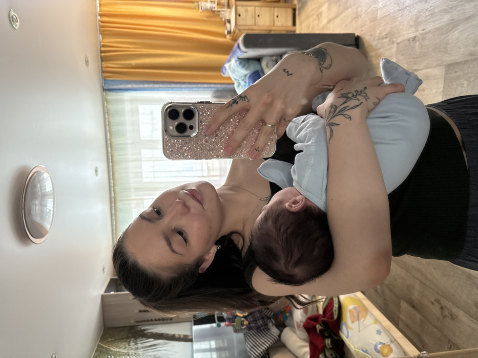 The image depicts an adult female holding an infant while taking a mirror selfie inside a residential dwelling. The specific location in Chaikovsky, Russia, cannot be determined from the visual evidence within the image, which showcases an interior setting. The adult female, positioned centrally, has long dark hair tied in a ponytail and is wearing a dark green ribbed tank top and dark-colored lower garments. She wears small silver earrings, a silver-colored necklace with a pendant, and a plain gold-colored ring on the ring finger of her left hand. Tattoos are visible on both forearms: a floral design on her left and smaller symbols on her right. She holds a smartphone with a glittering, light-colored case featuring multiple camera lenses in her left hand, directing it towards the mirror to capture the image. Her gaze is directed downwards and to her right, seemingly at the infant's reflection. The infant, cradled in the woman's right arm, is wearing a light blue sleeper. Only the back of the infant's head, showing dark hair, and its body are visible, with its face turned away from the camera's perspective. The background shows elements of a furnished room. To the left, a light-colored wooden crib or changing table is partially visible, featuring a white and yellow patterned fabric. Above it, a multi-colored toy or doll is present. The wall behind this area has a tropical-themed wallpaper with palm tree imagery. The floor throughout the visible space is wood-toned. In the center-right background, a window is covered by light sheer curtains and heavier yellow/orange drapes. Beyond the window, obscured outdoor details suggest a view of other structures. On the right, a small wooden nightstand or chest of drawers is visible next to a grey upholstered sofa or chair with a blue blanket. A circular light fixture is affixed to the white ceiling, with another smaller light fixture partially visible further back.