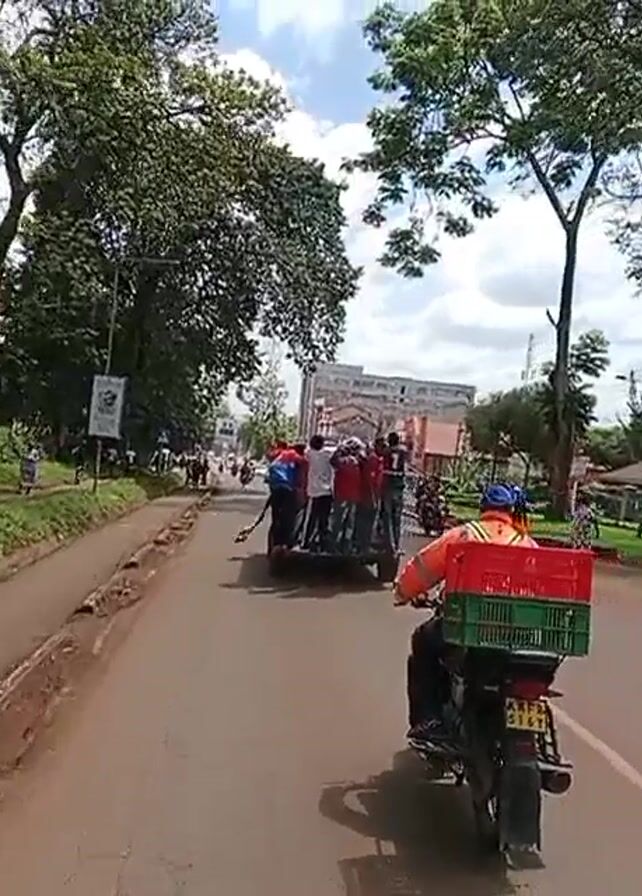 street scene in what appears to be a city. The camera is positioned behind a motorcycle moving down a road. The road is flanked by trees and a sidewalk with pedestrians. In front of the motorcycle is a slow-moving, open-topped vehicle carrying multiple people, most of whom are wearing red shirts. The motorcycle has a green and red crate attached to the back. In the background, buildings and a structure resembling a tower can be seen. The sky is partly cloudy.