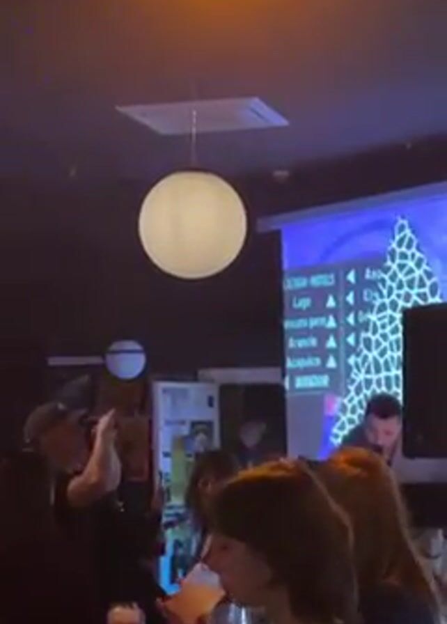 vibrant bar scene, where people are enjoying themselves. A DJ is seen performing, and several patrons are gathered near the bar, some with drinks in hand. A man in a cap is actively filming with his phone. The lighting is dim, with spherical light fixtures hanging from the ceiling. A screen displays various hotel names, adding a unique visual element to the setting. There's a lively atmosphere with people socializing and moving around.