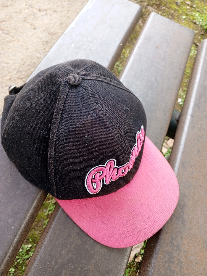 - "A black baseball cap with a pink brim rests on a weathered, brown park bench" by FM-fod0e2, licensed under CC BY 4.0