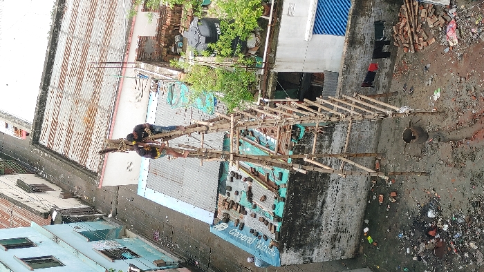 An elevated view captures an urban scene in Narayanganj, Bangladesh. In the foreground, two adult males are positioned at the apex of a tall, rudimentary scaffolding constructed from bamboo poles, secured with rope. The individual on the left wears a black t-shirt with yellow accents and dark shorts, while the individual on the right wears a black t-shirt and blue jeans. Both are actively manipulating a thick, rough-hewn wooden pole at the top of the structure. No safety equipment is visible on either individual. The scaffolding is erected on a muddy ground littered with diverse refuse, including plastic debris, brick fragments, and general waste. A dark metal bucket is partially embedded in the ground directly beneath the scaffolding, with a shallow trench extending from it. In the lower right, dark garments hang on a clothesline against a weathered wall, with scattered footwear and additional piles of bricks nearby. To the left of the scaffolding, a low-rise building features a corrugated metal roof, partially covered in a green tarp or paint, with numerous loose bricks scattered across its surface. A partial sign reading "General Works" is visible on the building's side. A third individual, wearing a light blue top and a white cap, is visible near the edge of this roof, facing away from the primary activity. Further left, a light blue multi-story building with dark-framed windows lines a narrow, debris-strewn alleyway. To the right of the scaffolding, a building with a flat concrete roof supports a black water tank labeled "GAZI" and several potted plants. The sky above is overcast, casting a diffused light on the scene.