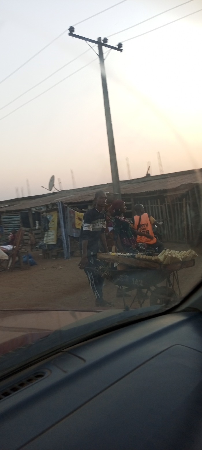 A roadside scene captured from inside a vehicle shows a man wheeling a cart filled with corn cobs, seemingly for sale. Two other individuals stand near the cart. The backdrop includes makeshift buildings and a utility pole against a hazy sky. The foreground is dominated by the car's dashboard.