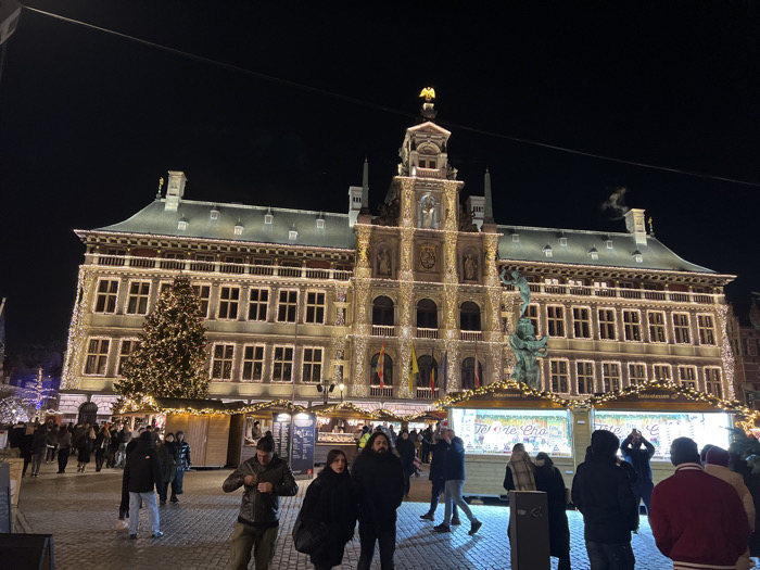 A nighttime scene showcases a large building illuminated with holiday lights and decorations. A Christmas tree stands prominently on the left. Market stalls are set up in front of the building, with people walking among them. The atmosphere suggests a Christmas market event. The building's architecture is ornate, and a statue is visible in the center.