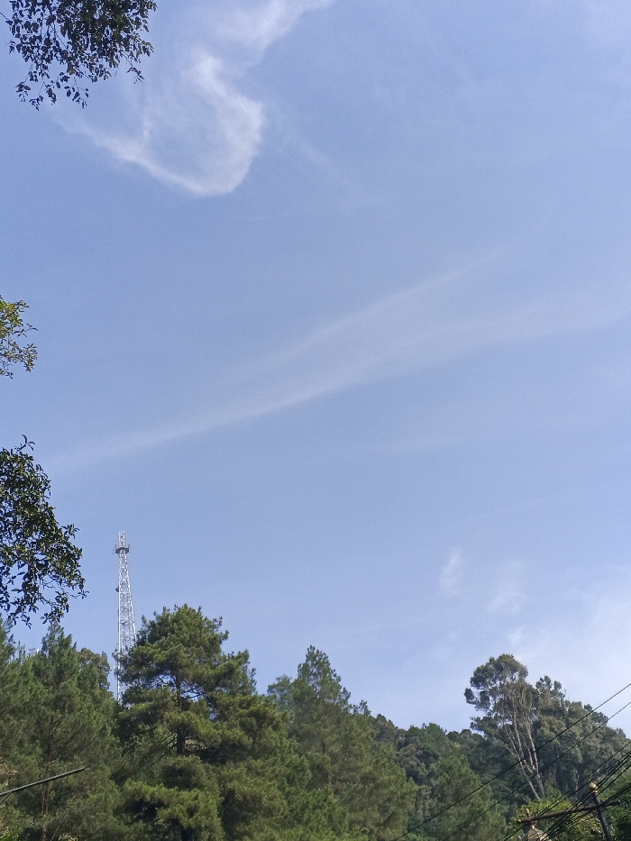 The image displays an outdoor scene in Basedth, Cambodia, under a clear, bright blue sky. Approximately two-thirds of the frame is occupied by the sky, which features sparse, wispy white cloud formations; one distinct, irregular cloud is visible in the upper-left quadrant, and a faint, elongated streak crosses the mid-sky from left to right. The lower third of the image is dominated by a dense, verdant treeline, suggesting a forested or heavily vegetated hillside. A prominent, tall, silver-colored lattice communication tower with multiple platforms and antennae is visible on the left, rising above the tree canopy. Dark utility lines are partially discernible among the trees in the lower-right corner. No individuals, actions, or interactions are present. The scene is illuminated by natural daylight.