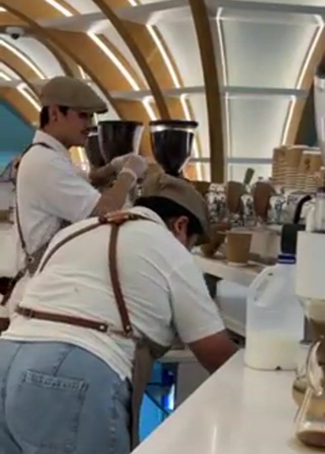 two baristas working in a coffee shop. They are wearing matching uniforms: white shirts, jeans, brown aprons, and brown newsboy caps. Both baristas are behind a white counter, preparing coffee. One is grinding coffee beans, while the other is preparing a drink. At one point, the barista with the completed drink turns to the camera and speaks. The coffee shop features a modern design with a white counter and a distinctive curved ceiling with light strips. A clear plastic milk jug sits on the counter along with coffee making equipment. Other customers and staff can be seen in the background.