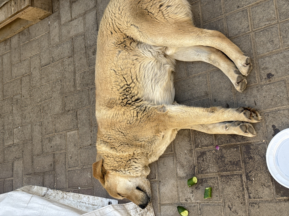 A tan-colored dog lies asleep on its left side on a paved surface in the Golan Regional Council, Israel