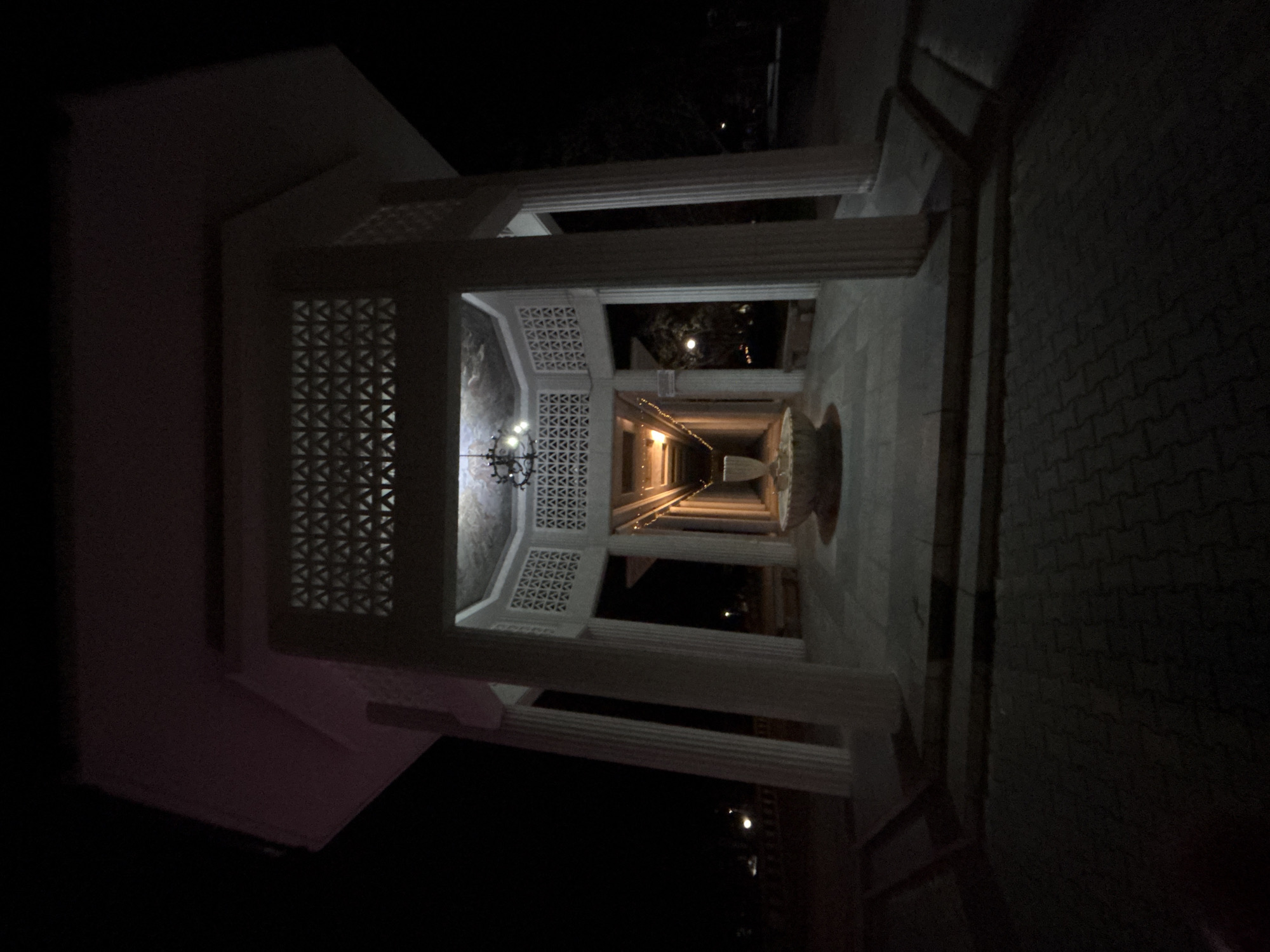 A dim, low-angle shot of a classical building's colonnade at night. The building has a white facade and columns with ornate detailing and geometrical patterned screens at the entrance of the colonnade. A vintage-style chandelier hangs from the ceiling. A stone pathway, possibly brick, is visible. The background fades into darkness. The building may be located in the city of Hisarya, Bulgaria.